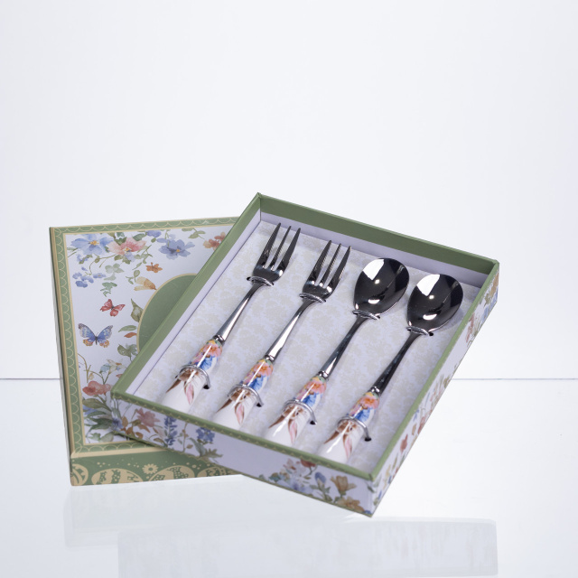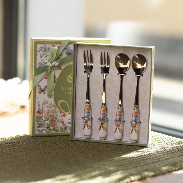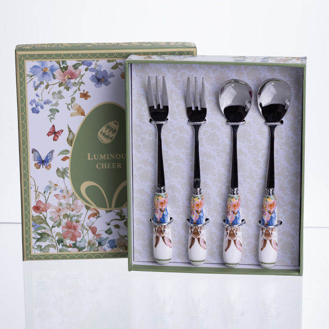 Набір столових приборів Garden Rabbits із 4 предметів призначений для сервірування десертів, тістечок та солодких закусок під час чаювання або святкового столу. Формат із двох десертних ложок та двох десертних вилок дозволяє подавати порційні страви, створюючи цілісне оформлення сервірування без зайвих елементів. Робоча частина приборів виготовлена з нержавіючої сталі з глянцевим покриттям, що забезпечує акуратний вигляд і зручність використання. Порцелянові ручки продумані для комфортного тримання та декоровані зображеннями кроликів, які гармонійно поєднуються з десертною подачею та тематичним посудом. Довжина кожного предмета становить 15 сантиметрів, що робить їх оптимальними для десертних страв. Набір підходить для щоденного використання, святкових подій, сімейних зустрічей або чаювання, допомагаючи підтримувати акуратне та організоване сервірування столу. Характеристики: Кількість предметів: 4 Комплектація: 2 десертні ложки, 2 десертні вилки Матеріал робочої частини: нержавіюча сталь Матеріал ручок: порцеляна Поверхня: глянцева