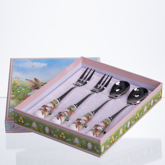 Набір столових приборів Rabbit Family із 4 предметів призначений для сервірування десертів, тістечок та солодких закусок під час чаювання або святкового столу. Формат із двох десертних ложок та двох десертних вилок дозволяє подавати порційні страви, створюючи цілісне оформлення сервірування без зайвих елементів. Робоча частина приборів виготовлена з нержавіючої сталі з глянцевим покриттям, що забезпечує акуратний вигляд і зручність використання. Порцелянові ручки продумані для комфортного тримання та декоровані зображеннями кроликів, які гармонійно поєднуються з десертною подачею та тематичним посудом. Довжина кожного предмета становить 15 сантиметрів, що робить їх оптимальними для десертних страв. Набір підходить для щоденного використання, святкових подій, сімейних зустрічей або чаювання, допомагаючи підтримувати акуратне та організоване сервірування столу. Характеристики: Кількість предметів: 4 Комплектація: 2 десертні ложки, 2 десертні вилки Матеріал робочої частини: нержавіюча сталь Матеріал ручок: порцеляна Поверхня: глянцева