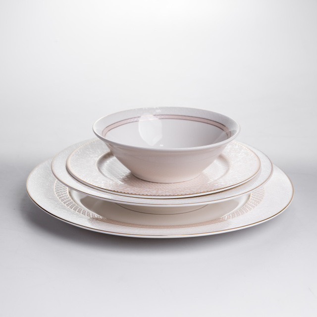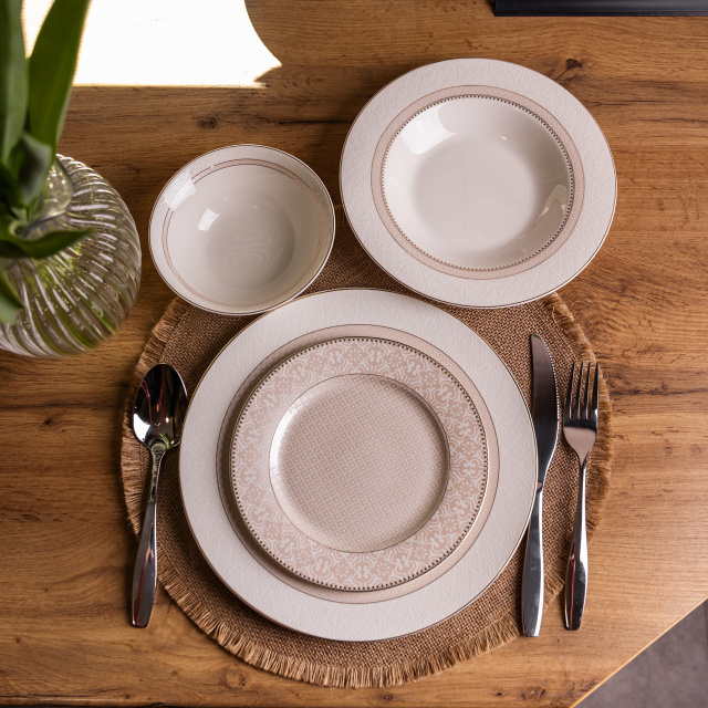 Столовий сервіз тарілок 24 штуки порцелянових на 6 персон. Цей набір столового посуду поєднує в собі стильний дизайн і якість. Він стане вашим надійним помічником у сервіруванні столу як для повсякденних трапез, так і для святкових застіль. Діаметр тарілок 14 см; 19 см; 22 см; 27 см; Об'єм глибокої тарілки: 300 мл. Основні переваги сервізу Універсальність: підходить як для повсякденного використання, так і для святкових застіль. Довговічність: порцеляна — це міцний і зносостійкий матеріал, який слугуватиме вам довгі роки. Естетичність: набір стане прикрасою вашого столу. Безпека: порцеляна не містить шкідливих речовин і безпечна для здоров'я. Легкість у догляді: набір можна мити в посудомийній машині. Такий столовий сервіз стане практичним і стильним доповненням вашої кухні. Він допоможе красиво сервірувати стіл і створити затишну атмосферу як під час повсякденних обідів, так і на святкових зустрічах із близькими. Набір поєднує в собі елегантний дизайн, міцність і зручність у використанні, тому стане чудовим вибором як для власного дому, так і як подарунок.