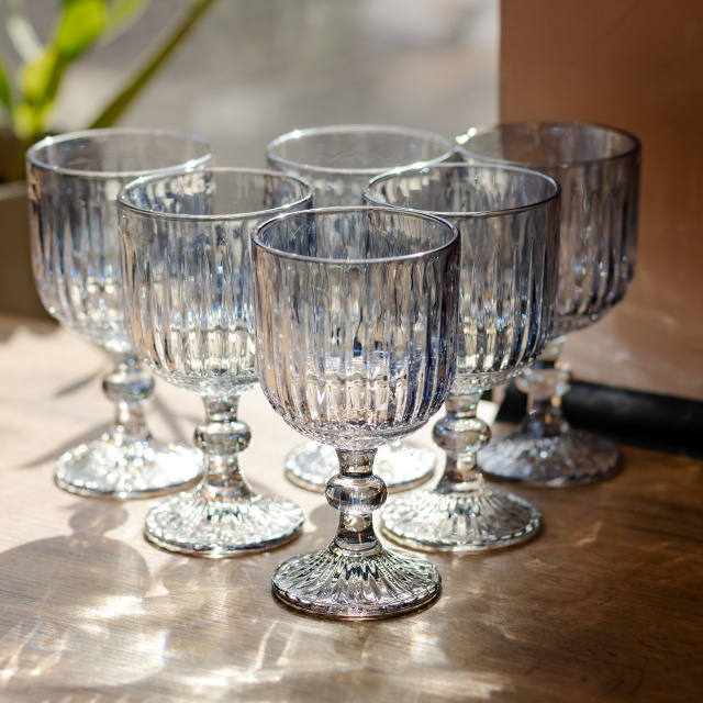 Набір келихів для вина об’ємом 300 мл призначений для подачі червоних і білих вин у повсякденному та святковому форматі. Виготовлені з товстого скла, келихи мають збалансовані пропорції та стійку конструкцію, що робить їх практичними у використанні. Поверхня келихів рифлена, з вертикальними лініями по всій чаші, що створює гру світла та додає виробу візуальної глибини. Чаша має форму широкого, відкритого кубка, злегка розширеного догори, що забезпечує зручну подачу вина. Келихи оснащені короткою фігурною ніжкою та широкою круглою основою, що гарантує стійкість і комфортний захват. Висота 16 см і діаметр 8.5 см роблять келихи зручними у користуванні, а набір із 6 штук стане практичним доповненням до домашнього посуду або сервірування столу. Характеристики: Тип: келихи для вина Кількість: 6 штук Об’єм: 300 мл Матеріал: товсте скло Висота: 16 см Діаметр: 8.5 см Дизайн: ребристий Форма чаші: широкий, відкритий кубок