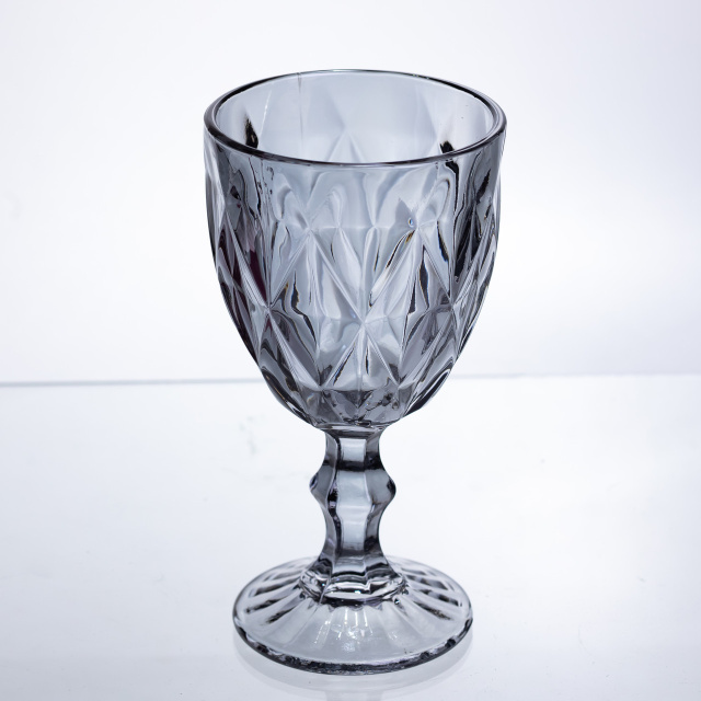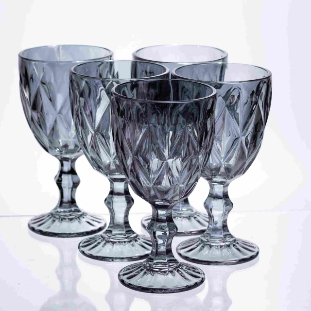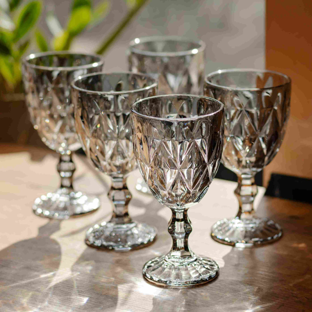 Універсальний комплект келихів із щільного тонованого скла. Завдяки класичній формі та значним обсягом, ці келихи стануть базовим елементом сервірування як для святкової вечері, так і для щоденного використання. Особливості: Ефект заломлення: Ромбоподібна алмазна грань по всій чаші створює глибокі тіні та гарні відблиски, підкреслюючи насичений колір напою. Практичний об'єм: 300 мл - "золотий стандарт". Підходить для червоного та білого вина, води, соку або густих коктейлів із льодом. Впевненість у руці: Масивна фігурна ніжка та пристойна вага келиха роблять його дуже стійким та приємним у використанні. Колірна гармонія: Димчастий графіт відмінно поєднується з будь-яким посудом і не втрачає своєї актуальності з часом. Характеристики: Матеріал: скло Об'єм: 300 мл Висота келиха: 16 см Вага набору: 2 кг