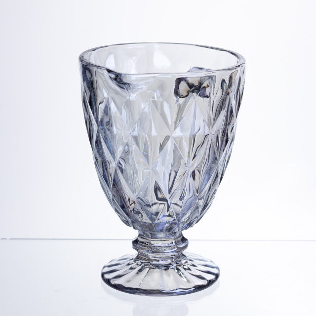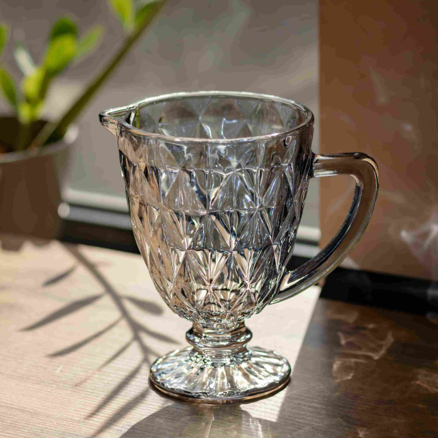 Елегантний глечик із тонованого скла холодного сталевого відтінку з блакитним підтоном. Витончений предмет для сервірування, який виглядає легко та повітряно завдяки поєднанню холодного кольору та прозорості. Особливості: Колірна палітра: Скло має благородний холодний димчастий тон із вираженим блакитним відливом. Декоративна фактура: Стінки декоровані великим алмазним огранюванням, що створює гарну гру світла. Комфортна експлуатація: Ергономічна ручка та грамотно спроектований носик забезпечують акуратний розлив напоїв без підтікання. Стійка основа: Графін надійно стоїть на фігурній ніжці, зберігаючи баланс навіть за повного заповнення. Характеристики: Матеріал: скло Об'єм: 1 л Розміри (діаметр/висота): 13/19,3 см Вага: 600 г