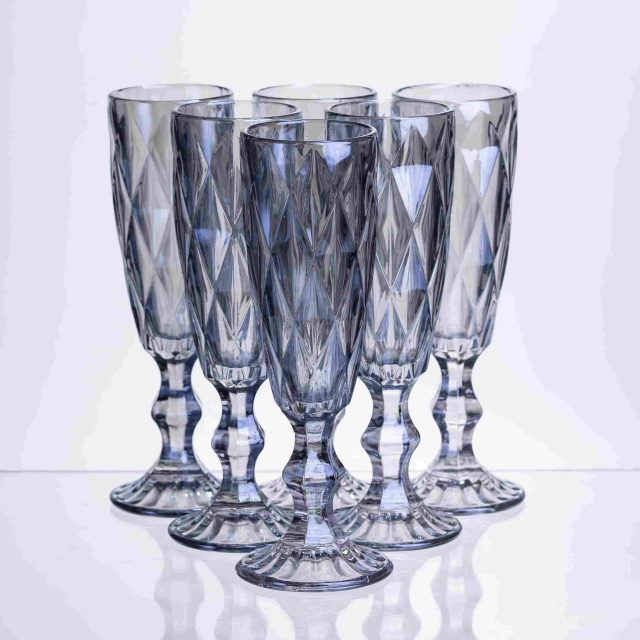 Елегантний набір з 6 келихів об'ємом 180 мл ідеально підійде для весіль, свят та стильного домашнього сервірування. Скло димчасто-блакитного відтінку з алмазною текстурою створює гру світла та витончений блиск. Переваги: Комплектація 6 шт. - ідеально для невеликих компаній і подарунка. Об'єм 180 мл – оптимальний для порції шампанського або ігристого вина. Привабливий дизайн, що підкреслює сервірування та інтер'єр. Міцне скло з декоративною обробкою легко комбінується з іншим посудом. Рекомендації щодо догляду: Рекомендується мити вручну м'якою губкою, уникаючи абразивів. При використанні посудомийної машини - вибирати делікатний режим і не розміщувати келихи у щільному зв'язуванні. Зберігати у стійкому положенні, щоб уникнути сколів. Характеристики Матеріал: скло Об'єм: 180 мл Висота: 19,3 см Вага: 2 кг