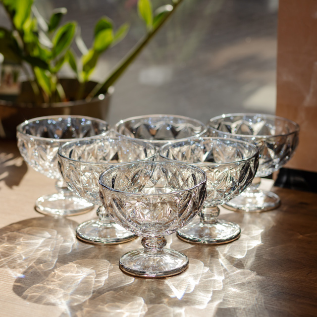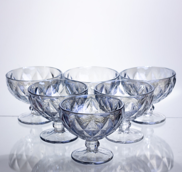 Вишукані креманки із тонованого скла в холодному сталевому відтінку з делікатним блакитним підтоном. Завдяки своїй фактурі та чистому кольору, вони
