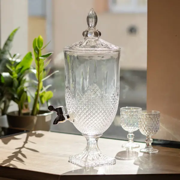 Елегантна скляна лимонадниця об'ємом 5 літрів із кришкою та краном ідеальна для подавання лимонаду, морсів, компотів і коктейлів на вечірках і застіллях. Підходить для домашніх і виїзних свят, кафе, кав'ярень і кейтрингу. Особливості: Об'єм: 5 літрів — вмістить напої для невеликої компанії. Матеріал: прозоре скло з декоративним шліфуванням. Кришка: скляна кришка, зберігає напій чистим і захищає від комах. Універсальність: підходить для холодних напоїв — лимонаду, морсів, компотів, холодного чаю, а також як декоративний елемент для буфету. Догляд: рекомендується мити вручну, акуратно протирати кран; не використовувати абразивні засоби для чищення. Переваги: Естетичний дизайн — має чудовий вигляд на столі та в кадрі. Практичність — великий об'єм і зручний кран. Надійність — міцне скло та стійка основа. Рекомендації щодо використання: Перед першим застосуванням промийте теплою водою. Не нагрівайте напої в ємності та не ставте на вогонь. Не використовуйте лимонадницю з гарячими напоями (понад 50 °C). Не допускайте різниці температур ємності та напою понад 25 °C. Не кладіть лід у порожній диспенсер, охолоджуйте тільки сам напій. Для видалення плям використовуйте м'яку губку та м'який мийний засіб. Характеристики: Матеріал: скло Об'єм: 5 л Діаметр: 19 см Висота: 52 см Матеріал краника: пластик Вага: 5,1 кг