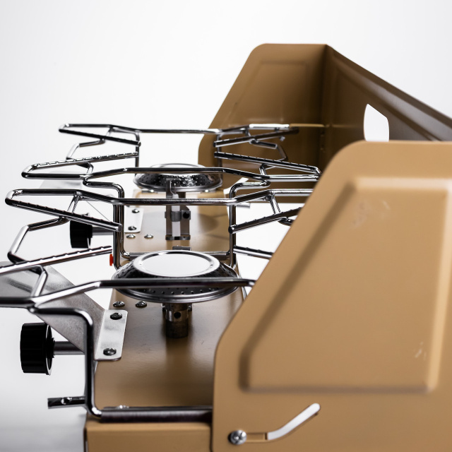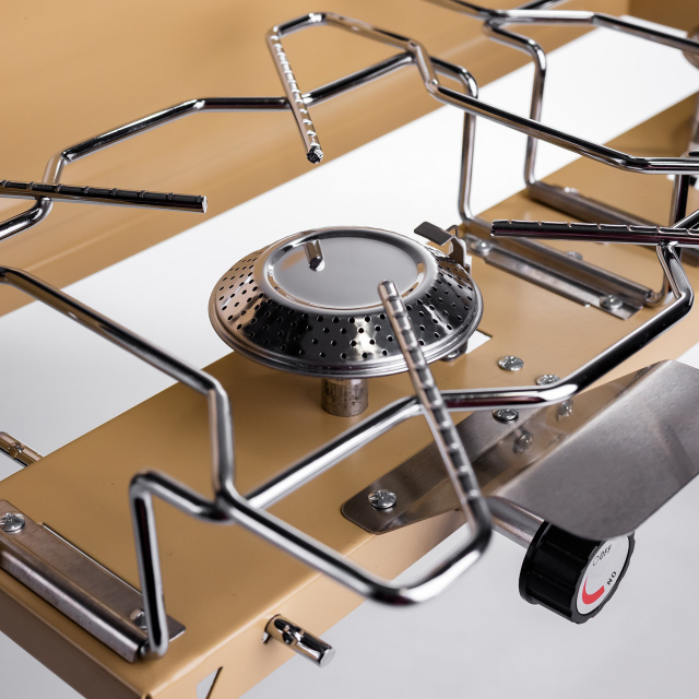 Універсальна портативна кухня, розроблена з акцентом на простоту підключення та надійність. Головна фішка цієї моделі - адаптери, які дозволяють використовувати практично будь-який тип туристичного газу без зайвого клопоту. Ідеально підходить для сімейного відпочинку та тривалих стоянок. Універсальність палива: Плита оснащена вбудованими конекторами, які підходять для найпопулярніших стандартів газу: Цангові балони: Високі «дихлофосні» балони підключаються безпосередньо знизу та фіксуються спеціальним затискачем. Різьбові балони (EPI-GAS): Для них також передбачено окремий роз'єм, що дозволяє використовувати якісніші газові суміші в холодну погоду. Перехідники в комплекті: У наборі є два адаптери, тому покупцеві не потрібно нічого докуповувати — він просто бере той газ, який є у найближчому магазині. Продуктивність та комфорт: Оптимальна потужність: Два пальники по 2.6 кВт кожна. Цього цілком достатньо для швидкої смаження м'яса або приготування супу у великому казанку. П'єзопідпал: Кожна конфорка запускається кнопкою. Більше не потрібно шукати запальничку на вітрі. Тонка регулювання: Поворотні ручки дозволяють точно налаштувати полум'я від "ледь помітного" для томлення каші до інтенсивного вогню. Вітрозахист: Високі борти корпусу захищають полум'я від задування, що критично важливо для економії газу та швидкості приготування на відкритому повітрі. Конструкція: Високі ніжки: Висота плити 34,5 см дозволяє комфортно готувати, не нахиляючись надто низько. Ніжки забезпечують стійкість навіть на нерівному ґрунті. Габарити: У розкладеному вигляді робоча поверхня становить 49,3×19 см, що дозволяє ставити дві каструлі середнього розміру одночасно. Компактне складання: Після використання ніжки та борти дозволяють легко підготувати плиту до транспортування. Характеристики: Потужність: 5,2 кВт Матеріал: сталь з емальованим покриттям, алюміній Розміри: 49,3*19*34,5 см Вага: 3,6 кг