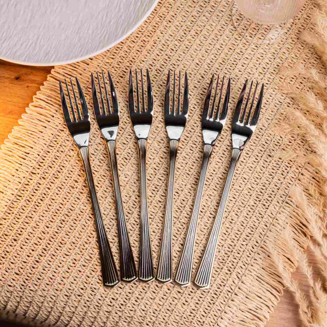 Столові прибори із дзеркальним поліруванням, виконані в класичному стилі. Призначені для повсякденного та святкового сервірування столу. Особливості: Матеріал: Нержавіюча сталь. Сплав стійкий до корозії та механічного впливу, не змінює смак та аромат страв. Полірування: Дзеркальна обробка поверхні забезпечує гладкість та блиск виробів. Ергономіка: Довжина прибору становить 20,5 см. Геометрія зубців та вага виробу розраховані на комфортне використання з іншими стравами та закусками. Догляд: Прибори підходять для очищення в посудомийній машині. Поверхня стійка до стандартних миючих засобів. Характеристики: Матеріал: нержавіюча сталь Довжина: 20,5 см Вага набору: 200 г