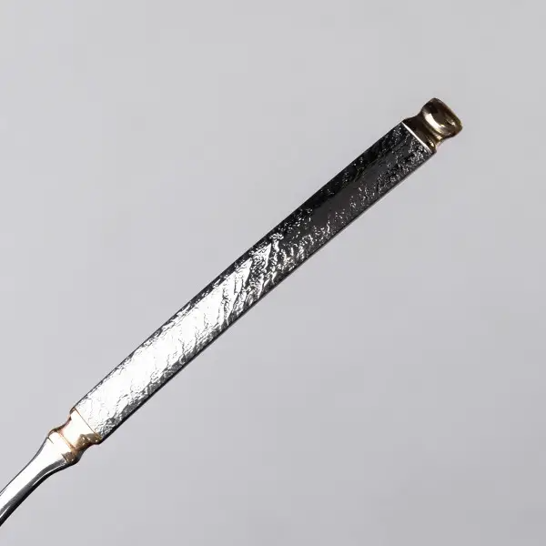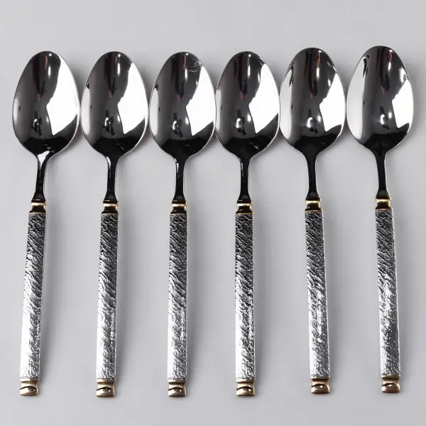 Повнорозмірні столові прибори, що вирізняються виразним дизайном. Відмінно підходять для повсякденного та урочистого сервірування Особливості: Матеріал: Нержавіюча сталь. Сплав характеризується високою корозійною стійкістю, механічною міцністю та хімічною інертністю до харчових продуктів. Черпак: Класичної овальної форми з гладким дзеркальним поліруванням, що забезпечує комфортне використання та легке очищення. Фактурна рукоять: Виконана із застосуванням технології об'ємного тиснення, яка створює складний рельєфний візерунок, що імітує природну текстуру. Розмір: Довжина ложки становить 21 см, що відповідає стандарту для подачі перших страв, каш та гарнірів. Характеристики: Матеріал: нержавіюча сталь Довжина: 21 см Вага набору: 400 г