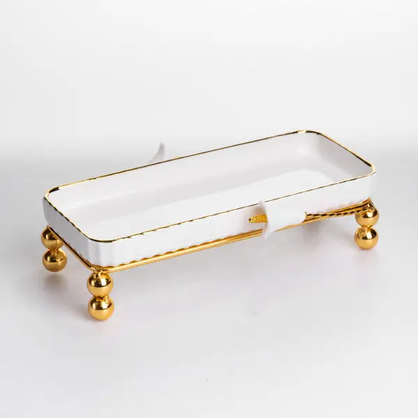 Прямокутне фарфорове блюдо на витонченій металевій підставці. Модель відрізняється оригінальним декоративним рішенням: ручки підставки виконані у...