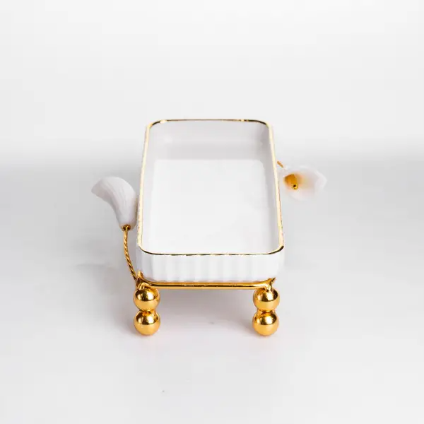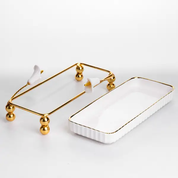 Прямокутне фарфорове блюдо на витонченій металевій підставці. Модель відрізняється оригінальним декоративним рішенням: ручки підставки виконані у вигляді квітів білої калли, що розпустилися, з золотистими серединками. Особливості: Матеріал: Якісний білий фарфор. Матеріал має гладку, щільну структуру, стійкий до термічних впливів та не вбирає запахи. Матеріал підставки: Метал із зносостійким покриттям. Конструкція підставки забезпечує стійке положення страви та зручність її переміщення. Конструкція: Підставка оснащена ніжками, які піднімають блюдо над поверхнею столу, захищаючи його від перегріву та подряпин. Розмір: Вузька витягнута форма блюда оптимальна для подачі роликів, канапе, порційних десертів, сирних сетів та м'ясних нарізок. Характеристики: Матеріал: порцеляна Розміри: 25*10*3,5 см Висота з підставкою: 6,5 см Вага: 900 г