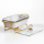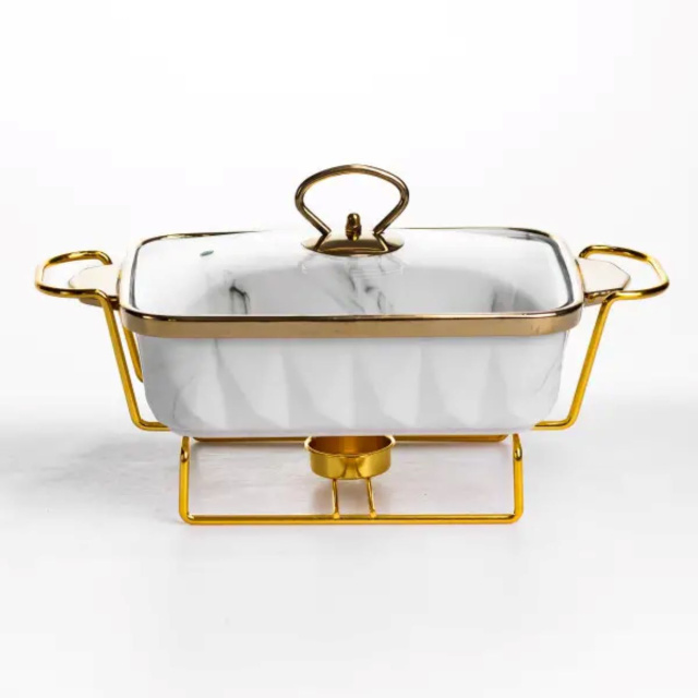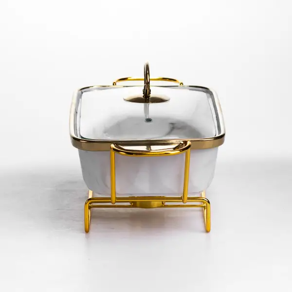 Мармітниця порцелянова прямокутної форми призначена для подачі гарячих страв із підтриманням температури під час сервірування. Конструкція з металевою підставкою та підігрівом від двох свічок-таблеток дозволяє зберігати тепло без використання електроенергії, що зручно для дому або заходів. Формат підходить для розміщення на обідньому чи святковому столі. Ємність об’ємом 1 л оптимальна для гарнірів, других страв або закусок. Порцелянова чаша рівномірно утримує тепло, а металева підставка золотистого кольору забезпечує стійкість та передбачає місце для двох свічок, що сприяє більш рівномірному підігріву. Прямокутна форма дозволяє ефективно використовувати простір на столі. Мармітниця має зручні габарити та достатню вагу для стабільного використання. Конструкція легко розбирається, що спрощує очищення та зберігання. Підходить для щоденного використання або подачі страв під час прийому гостей. Характеристики: Форма: прямокутна Матеріал ємності: порцеляна Матеріал підставки: метал Колір підставки: золотистий Об’єм: 1 л Джерело підігріву: 2 свічки-таблетки Висота: 11 см Довжина: 16 см Ширина: 31 см Вага: 1.7 кг