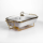Мармітниця порцелянова прямокутної форми призначена для подачі гарячих страв із підтриманням температури під час сервірування. Конструкція з металевою підставкою та підігрівом від двох свічок-таблеток дозволяє зберігати тепло без використання електроенергії, що зручно для дому або заходів. Формат підходить для розміщення на обідньому чи святковому столі. Ємність об’ємом 2 л оптимальна для гарнірів, других страв або закусок. Порцелянова чаша рівномірно утримує тепло, а металева підставка золотистого кольору забезпечує стійкість та передбачає місце для двох свічок, що сприяє більш рівномірному підігріву. Прямокутна форма дозволяє ефективно використовувати простір на столі. Мармітниця має зручні габарити та достатню вагу для стабільного використання. Конструкція легко розбирається, що спрощує очищення та зберігання. Підходить для щоденного використання або подачі страв під час прийому гостей. Характеристики: Форма: прямокутна Матеріал ємності: порцеляна Матеріал підставки: метал Колір підставки: золотистий Об’єм: 2 л Джерело підігріву: 2 свічки-таблетки Висота: 15,5 см Довжина: 22,5 см Ширина: 40 см Вага: 3,1 кг