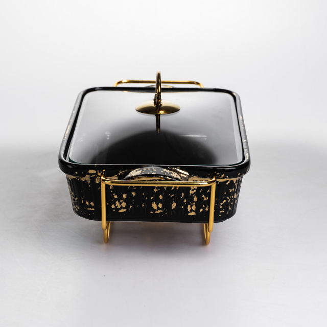 Мармітниця має прямокутну форму та виготовлена з порцеляни чорного кольору з декоративним золотистим вкрапленням по поверхні. Такий дизайн підходить для сервірування гарячих страв під час банкетів, фуршетів або сімейних подій. Порцеляна забезпечує збереження температури та підходить для подачі різних видів страв. Виріб укомплектований прозорою скляною кришкою з металевою ручкою, що дозволяє контролювати вміст без відкривання. Кришка щільно прилягає, допомагаючи мінімізувати втрати тепла та підтримувати охайний вигляд подачі протягом усього часу використання. Мармітниця встановлена на металевій підставці золотистого кольору з підігрівом від свічок-таблеток. Такий тип нагріву не потребує електроживлення та забезпечує рівномірне підтримання температури. Конструкція підставки стійка та розрахована на багаторазове використання.
