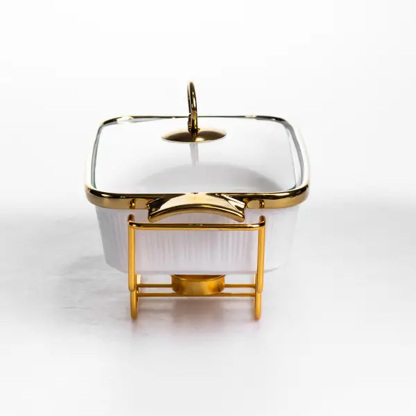 Порцелянова мармітниця об’ємом 1 л призначена для подачі гарячих страв із підтриманням температури під час сервірування столу. Прямокутна форма зручна для розміщення основних страв, гарнірів або запіканок. Скляна кришка дозволяє контролювати вміст без відкривання, що допомагає зберігати тепло та зовнішній вигляд подачі. Конструкція передбачає металеву підставку із місцем для однієї свічки-таблетки, яка забезпечує м’який підігрів. Такий формат підходить для використання вдома або під час святкових подій, коли важливо довше зберігати температуру страв без повторного розігріву. Компактні габарити дозволяють зручно розмістити мармітницю на столі без зайвого навантаження простору. Поєднання порцелянової ємності, скляної кришки та металевої підставки формує практичний варіант для подачі. Виріб легко очищується після використання та підходить для регулярного застосування. Такий формат подачі допомагає організувати стіл більш впорядковано та підтримувати температуру страв протягом усього приймання їжі. Характеристики: Об’єм: 1 л Форма: прямокутна Матеріал ємності: порцеляна Кришка: скляна Підставка: металева Тип підігріву: від однієї свічки-таблетки Висота: 11 см Ширина: 16 см Довжина: 31 см Вага: 1,7 кг