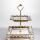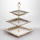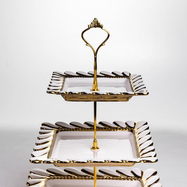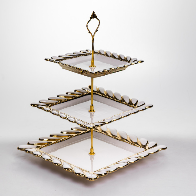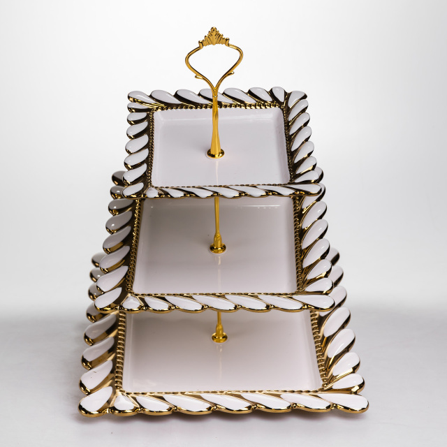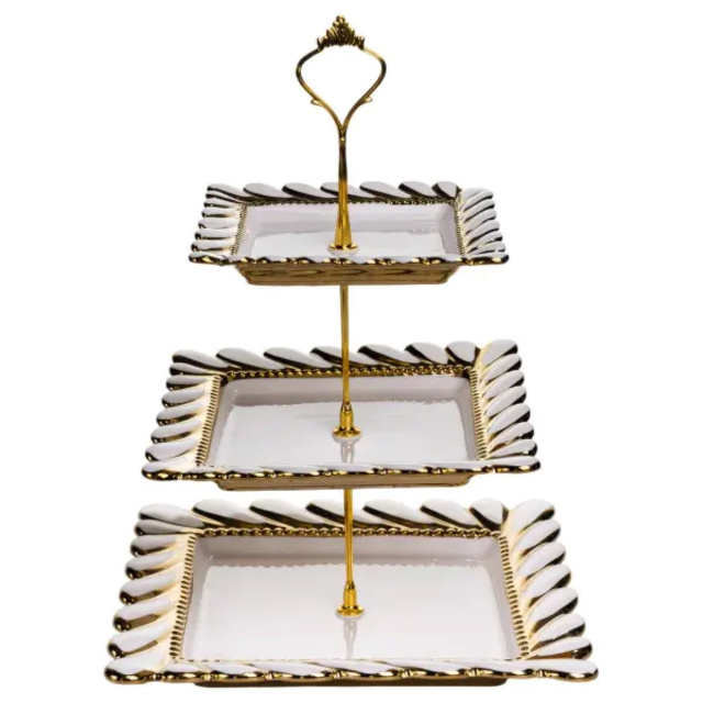 Порцелянова етажерка на 3 яруси призначена для багаторівневого сервірування столу. Виріб складається з трьох квадратних тарілок різного розміру, закріплених на металевій позолоченій підставці. Нижній ярус має найбільшу тарілку, а верхні поступово зменшуються, що забезпечує зручне розміщення страв. Тарілки виготовлені з порцеляни та мають хвилястий край, форма якого нагадує пелюстки квітки. Поєднання квадратної форми з м’якими хвилястими лініями створює збалансований і охайний вигляд. Тонка золота окантовка вздовж краю підкреслює форму тарілок і гармонійно поєднується з позолоченою металевою конструкцією. Етажерка підходить для подачі десертів, фруктів, випічки або закусок. Різний розмір тарілок дозволяє зручно розподіляти продукти за типом і об’ємом, зберігаючи порядок на столі. Виріб може використовуватися як у повсякденному сервіруванні, так і під час святкових заходів. Характеристики: Тип: порцелянова етажерка Кількість ярусів: 3 Матеріал тарілок: порцеляна Кількість тарілок: 3 Форма тарілок: квадратна Розмір тарілок: різний