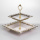 Двоярусна порцелянова фруктовниця призначена для компактного та зручного сервірування столу. Виріб складається з двох квадратних тарілок, розміщених на металевій позолоченій підставці, що забезпечує стійкість конструкції та раціональне використання простору. Формат підходить для подачі фруктів, десертів або солодкої випічки. Тарілки виготовлені з порцеляни та мають хвилястий край, форма якого нагадує пелюстки квітки. Поєднання квадратної основи з м’якими хвилястими лініями створює акуратний і збалансований вигляд. Тонка золота окантовка вздовж краю підкреслює форму тарілок і гармонійно поєднується з позолоченою металевою підставкою. Фруктовниця підходить для щоденного використання та сервірування святкового столу. Двоярусна конструкція дозволяє зручно розміщувати різні види продуктів, не перевантажуючи поверхню столу. Виріб може стати практичним елементом сервірування або доречним подарунком. Характеристики: Тип: двоярусна фруктовниця Матеріал тарілок: порцеляна Кількість тарілок: 2 Форма тарілок: квадратна Край: хвилястий Декор: тонка золота окантовка