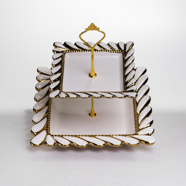 Двоярусна порцелянова фруктовниця призначена для компактного та зручного сервірування столу. Виріб складається з двох квадратних тарілок, розміщених