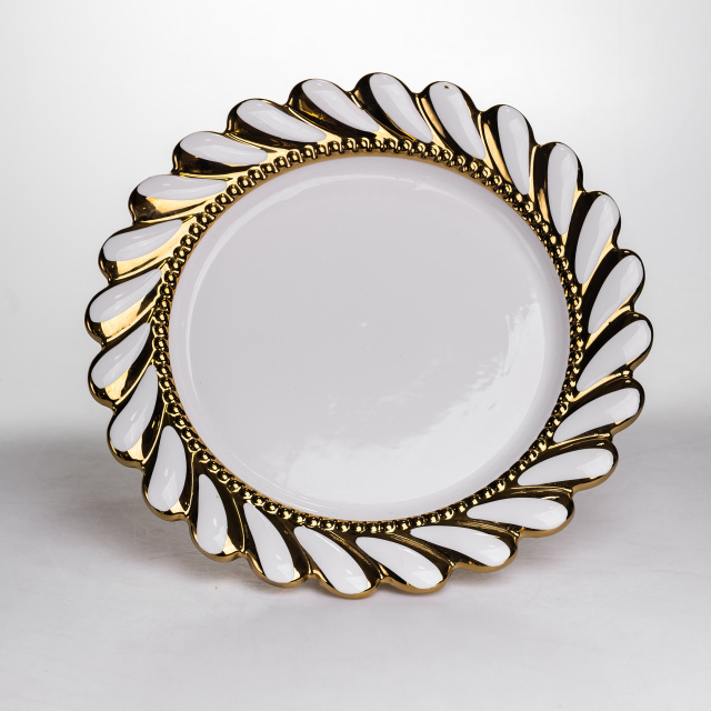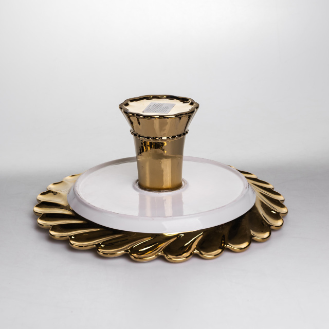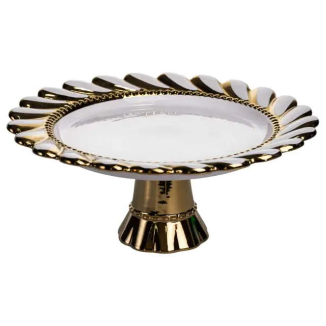 Порцелянова тортівниця на ніжці поєднує класичну елегантність із функціональністю. Білий порцеляновий корпус забезпечує чистоту й легкість візуального сприйняття, а декоративний обідок із золотим оздобленням підкреслює форму та додає чіткості лініям. Візерунок на обідку складається з дрібних рельєфних елементів, що нагадують намистини або листочки, створюючи витончений акцент без надмірної помпезності. Ніжка тортівниці масивна, золотого кольору, з плавними лініями, що розширюються донизу. Вона забезпечує стійкість виробу та надійну опору для страв різної ваги. Така конструкція робить тортівницю практичною для щоденного використання, а одночасно додає столу елегантності під час сервірування десертів або святкових страв. Поєднання білої порцелянової основи та золотих акцентів робить тортівницю декоративним елементом у будь-якому інтер’єрі. Орнамент із дрібних рельєфних деталей створює стильну композицію, яка виглядає органічно та підкреслює увагу до деталей у сервіруванні, не перевантажуючи загальний дизайн. Характеристики: Матеріал: порцеляна Декор: рельєфний обідок із дрібними елементами, золота окантовка Форма: кругла, на ніжці