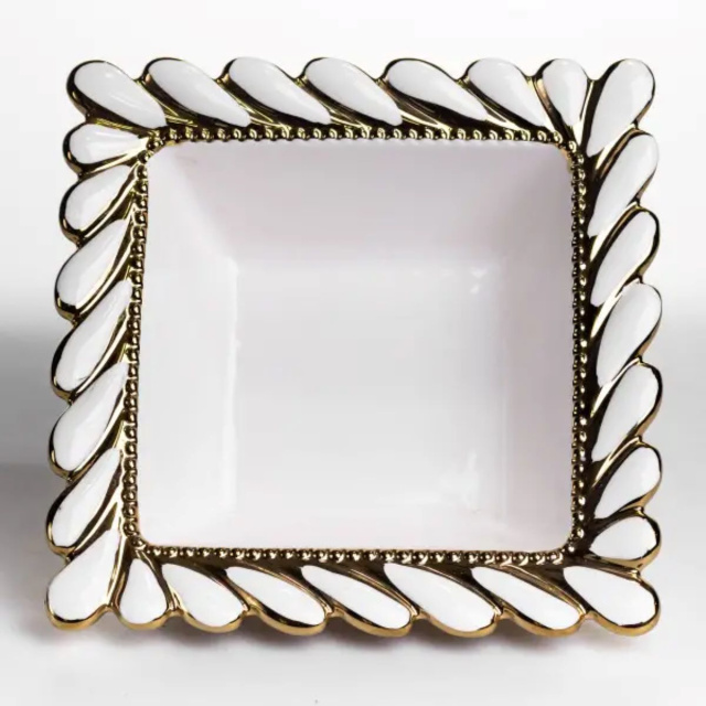 Глибока квадратна тарілка Tiffany з порцеляни привертає увагу чіткою геометрією та компактним форматом. Розмір 26×26 см і висота 8 см роблять її зручною для порційної подачі страв, де важлива не лише функціональність, а й акуратний вигляд на столі. Тарілка підходить для щоденного використання: у ній зручно подавати супи, салати, гарніри або десерти. Завдяки глибині 8 см вміст добре утримується всередині, а квадратна форма допомагає ефективно використовувати простір на столі чи в сервіруванні. Вага 1.2 кг забезпечує баланс між легкістю та стійкістю під час використання. Край тарілки оформлений рельєфним узором у вигляді переплетеного каната по всьому периметру. Контрастне поєднання світлої основи з золотистими акцентами підкреслює форму виробу й додає чіткості контуру. Такий декор виглядає виразно, але не перевантажує загальний вигляд, тому тарілка легко поєднується з різним посудом у сервіруванні. Характеристики: Матеріал: порцеляна Форма: квадратна Розміри: 26 × 26 см Об'єм: 1.5 л Висота: 8 см Вага: 1.2 кг